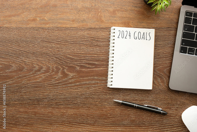 Notebook with 2024 goals text on it to apply new year resolutions and plan.