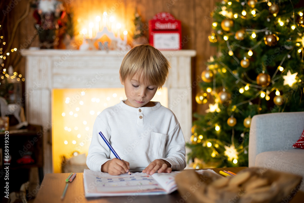 Beautiful blond child, young school boy, writing homework for school in a decorated home, drinking milk and eating cookies. Ligths and knitted toys