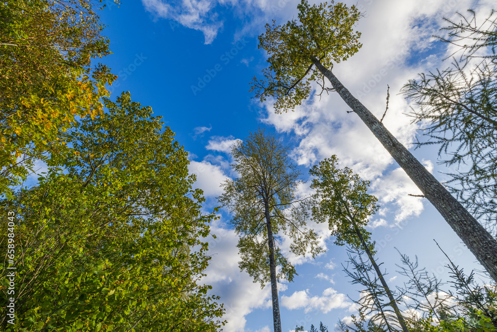 Beautiful view from bottom up to forest autumn trees on background of blue sky with white clouds.
