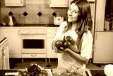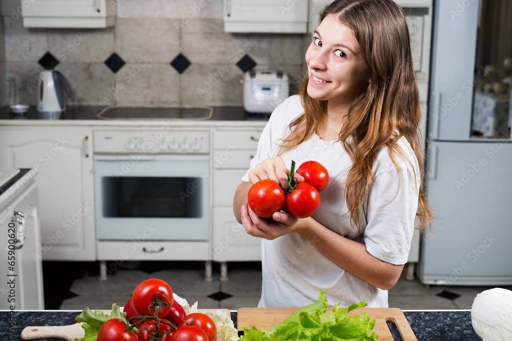 Young woman with tomato showing bunch of tomatoes