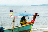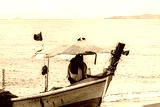 The local fisherman is clearing fishing net at the boat after fishing or working at the sea beach in Thailand.