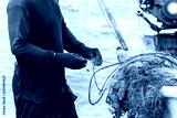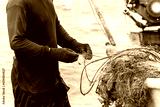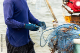 The local fisherman is clearing fishing net at the boat after fishing or working at the sea beach in Thailand.