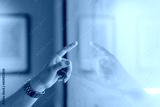 Woman using interactive touchscreen display at modern museum. Education and technology concept