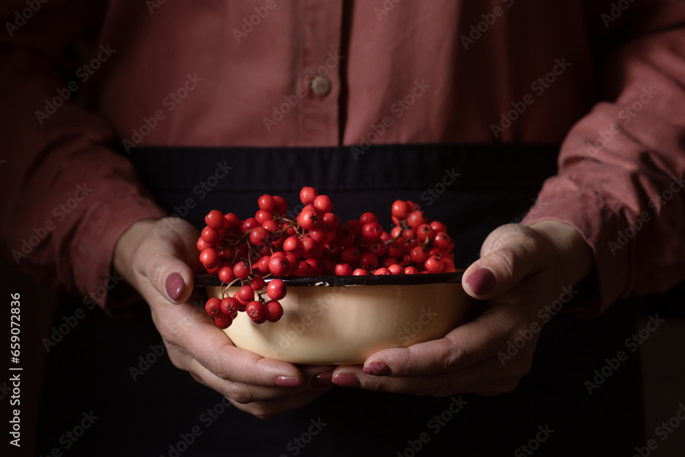 A woman in a red dress holds in her hands a bunch of rowan berries, red berries, natural vitamins, autumn manicure