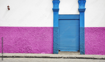Street view of an old colonial building facade, architecture background, Cuenca, Ecuador.