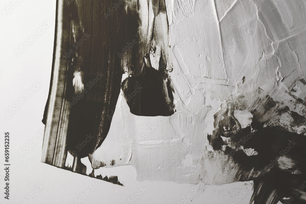 Art oil and acrylic smear blot canvas painting stucco wall. Abstract texture black and white color stain brushstroke relief texture background.