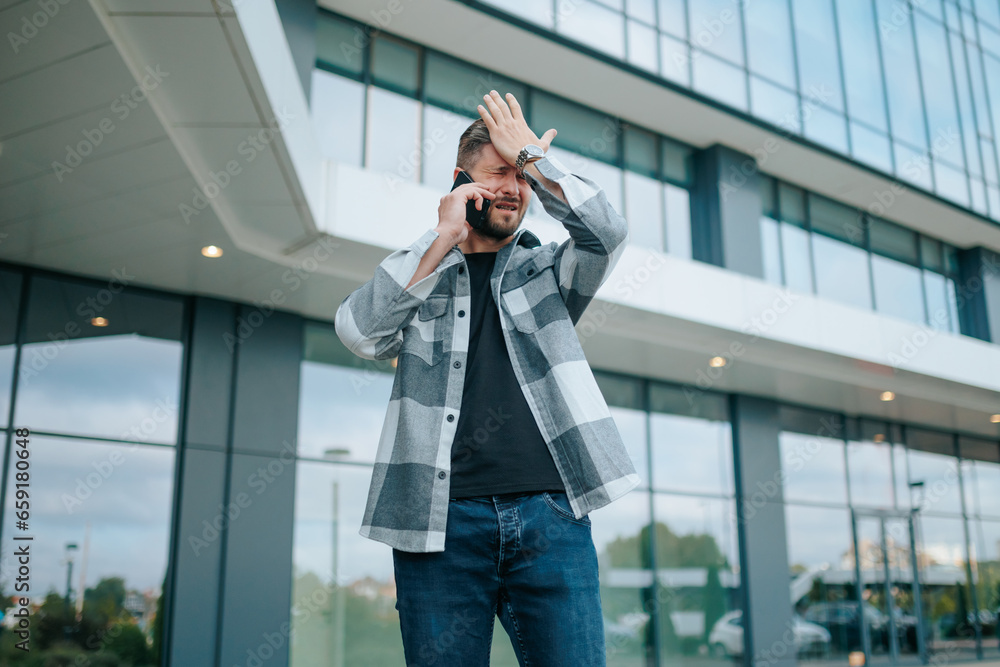 An anxious young bearded man talks on his phone outdoors, looking serious. Upset Male in Urban Environment Having an Emotional Conversation