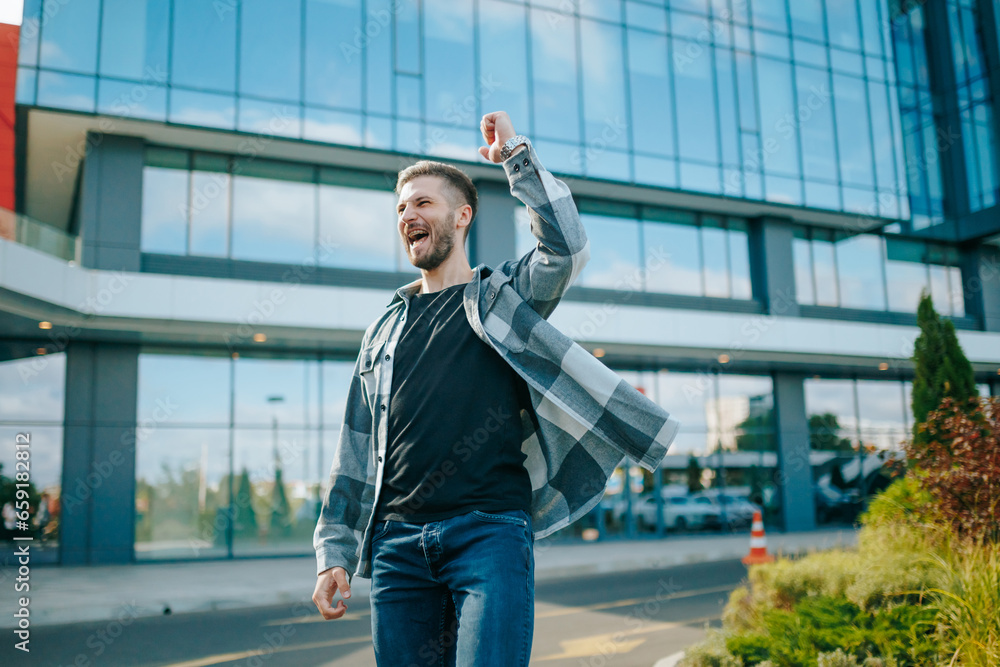 In the heart of the urban jungle, a young man of Latino heritage shines with happiness. His authentic joy is a testament to his success against the city street backdrop.