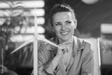 happy business owner woman in green blouse in green office