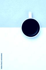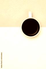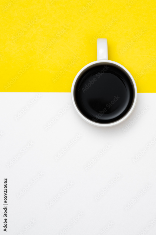 A cup of espresso coffee on a yellow and white desk background. Cozy flatlay and top view with Plenty of space for wording. Coffee mug and working routine. Minimalist concept.