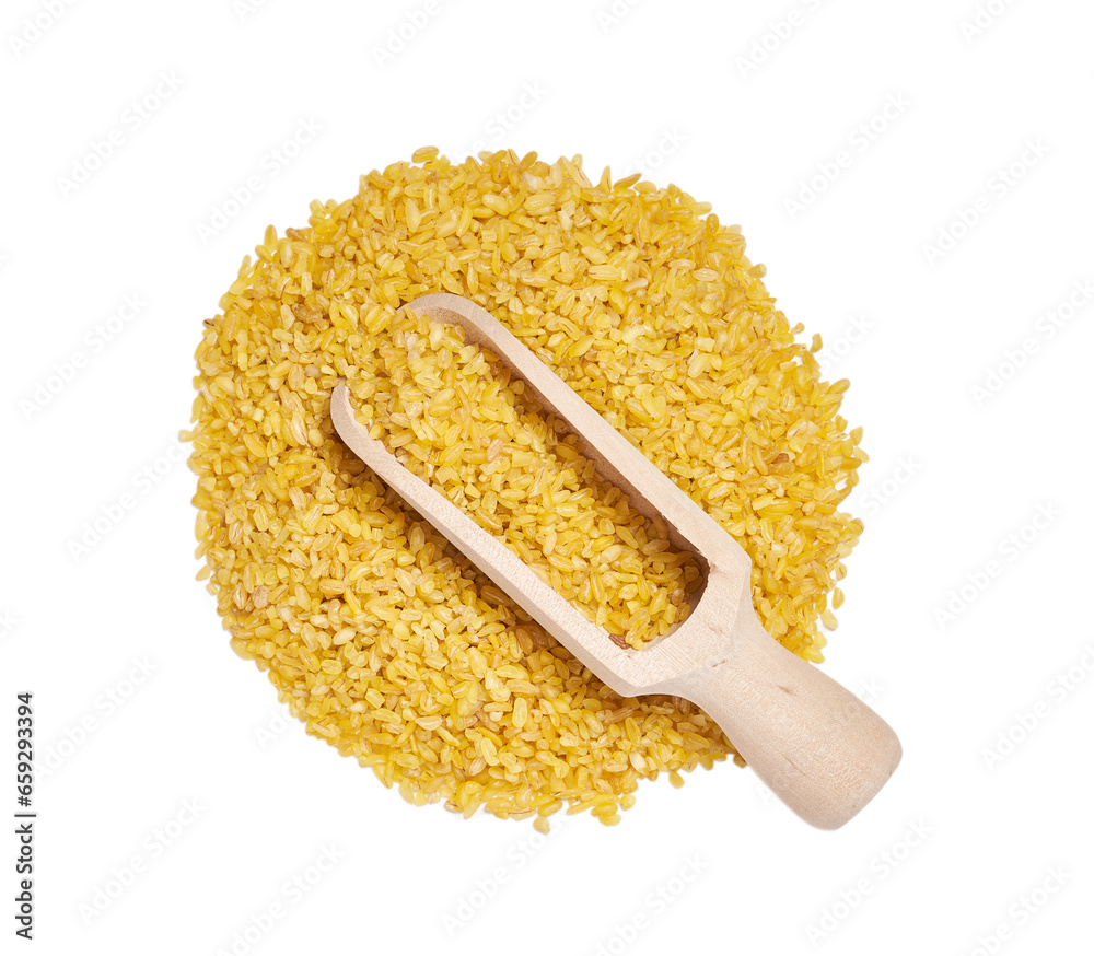 top view flat lay bulgur durum wheat isolated on white background. pile of bulgur durum wheat isolated. heap of bulgur durum wheat in wood scoop isolated