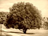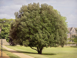 lone round crowned Holm Oak Quercus ilex on a mowed lawn with a house and bright clouds in the background