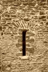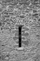closeup detail of a tall narrow loophole window in ancient twelfth century stone building at St Johns College in Cambridge England