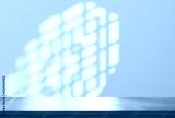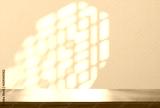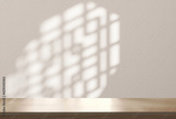 Blank brown wooden counter table in sunlight, Chinese round window grill shadow on beige fabric texture wallpaper wall for luxury Asian organic beauty, cosmetic, skincare product display background 3D