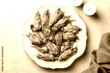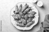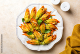 Zucchini Flowers stuffed with ricotta cheese, egg and bread crumbs, parsley. Oven baked courgette or pumpkin flowers. Italian dish fiori di zucca on a white plate.