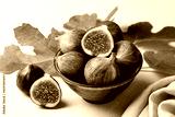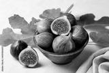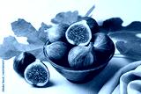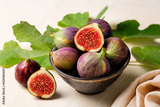 Bowl with fresh ripe purple figs fruit with green leaves. Beige table surface.