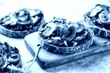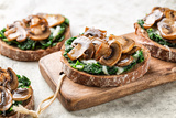 Wooden board with garlic mushroom sandwiches with spinach and cheese, open faced sandwich or bruschetta with Rye sourdough bread and champignon. Light background.