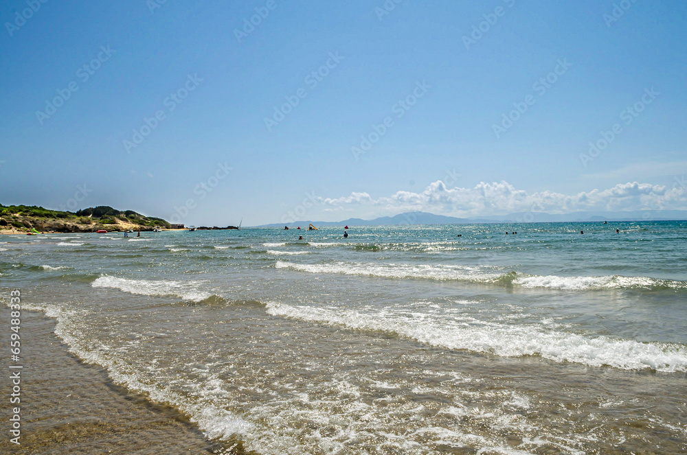 Beautiful Coastline in Western Greece. Lovely Seaview and Beach with Golden Sand and Waves. People Swimming at the Bay on a Sunny Day with Blue Sky.