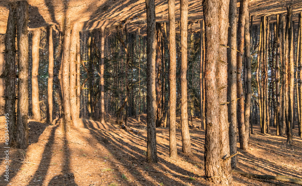 Empty tree trunks grow from the ground into the ground. Futuristic image.
