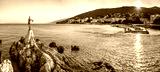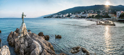 The Maiden with the Seagull. The statue is the symbol of Opatij, Croatia. Beautiful panoramic view of Opatija town.