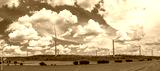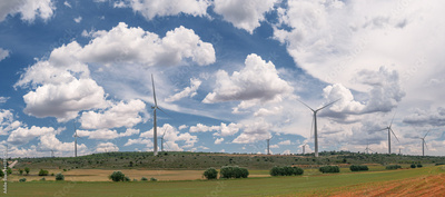 Wind turbines in rural landscape and stunning cloudy sky at the background. Environmentally friendly production of electrical energy.