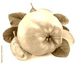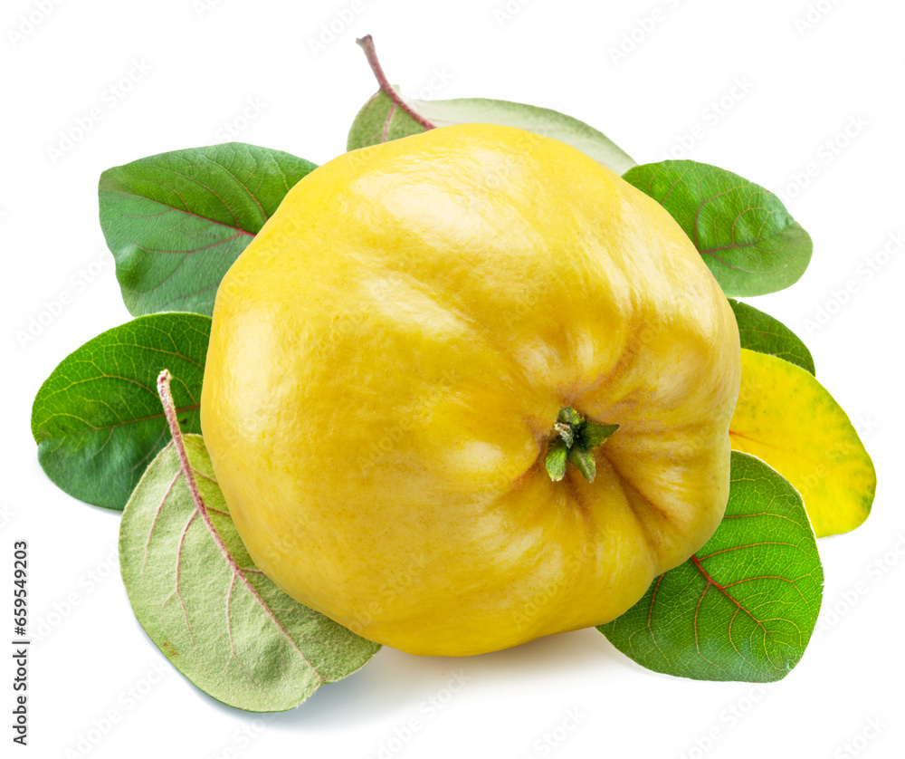 Ripe apple quince with green leaves isolated on white background.