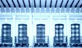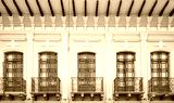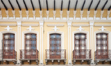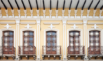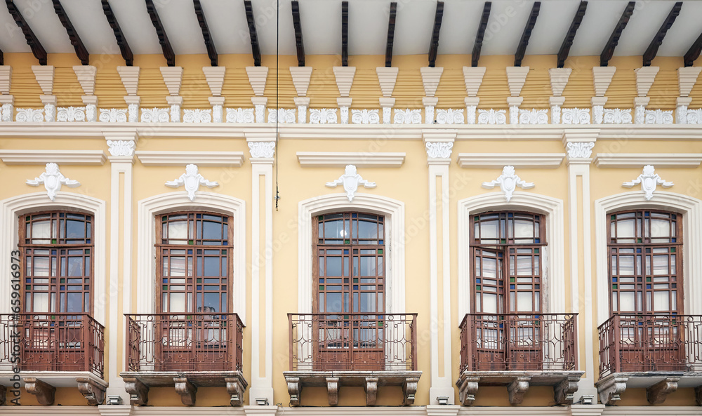 Street view of an old colonial building facade, Cuenca, Ecuador.