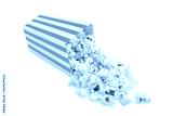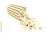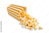 Tasty cheese popcorn falling out of yellow striped carton bucket, isolated on white, transparent background, PNG. Scattering of popcorn grains. Movies, cinema and entertainment concept.