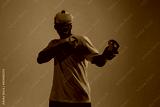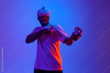 shocked african american male gamer in virtual reality glasses shoots and aims with joysticks in neon lighting