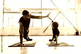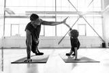 African-American boy doing exercises on yoga mat and doing push-ups with his dad, man training his son