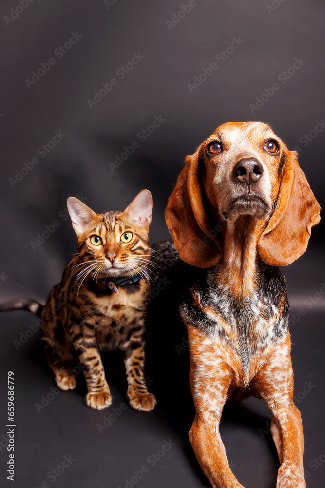 Bangal cat and mixed bred of German shorthaired pointer, photoshoot in studio.