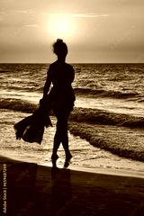 Woman on the seashore in a beautiful evening scenery. Girl walking on the beach with the setting sun in the background. Photo taken at the Baltic Sea in Leba, Poland.