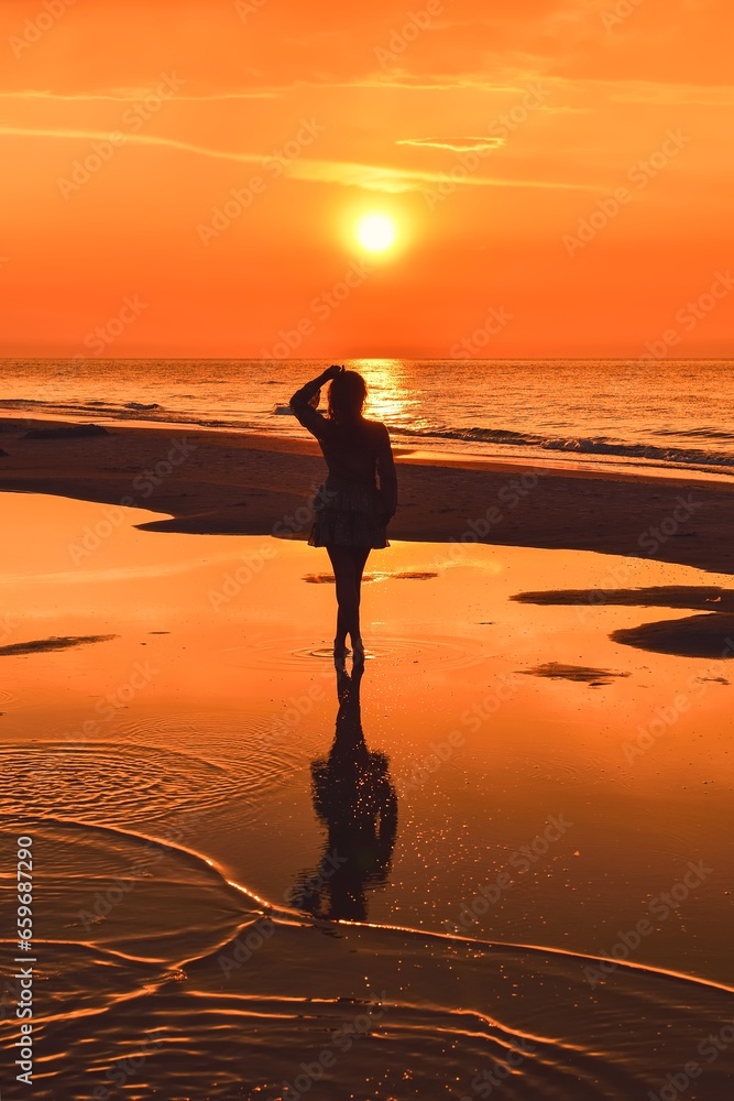 Woman on the seashore in a beautiful evening scenery. Girl walking on the beach with the setting sun in the background. Photo taken at the Baltic Sea in Leba, Poland.