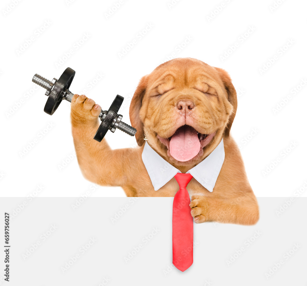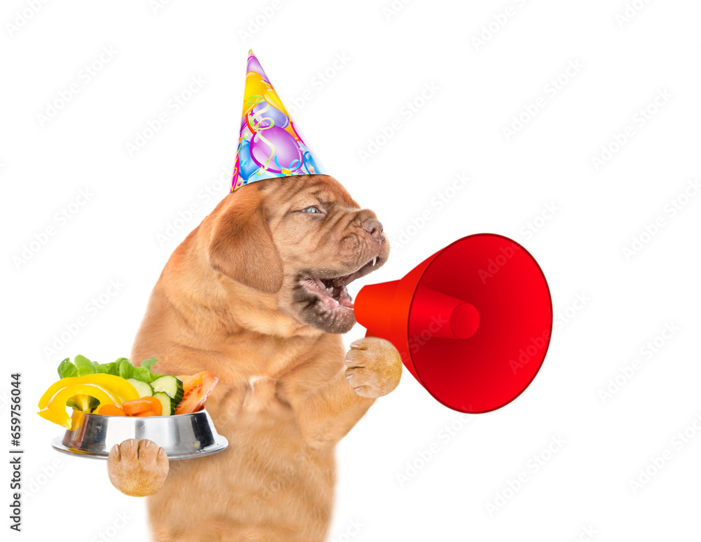 Mastiff puppy holding bowl of vegetables and screaming into a megaphone. isolated on white background