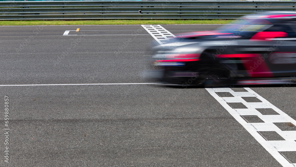 Race car blurred motion crossing the finish line on international circuit speed track, Motion blur Racing car crossing finish line on asphalt race track.