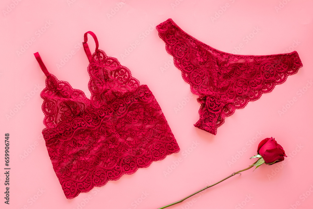 Red lace panties and bra with red rose for romantic gift