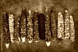 Several ripe and colorful corn cobs lie next to each other against a gray background. The corn cobs have different colors.