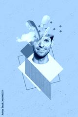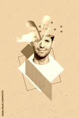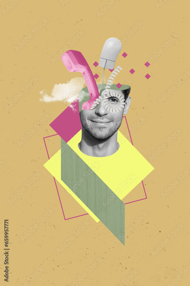 Vertical collage picture of black white colors guy head pc mouse handset telephone inside isolated on beige background