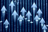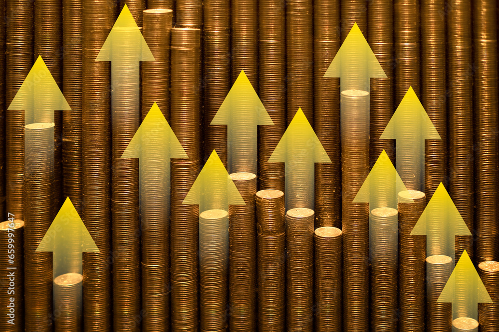 Stacks of coins with up arrows, inflation growth, key rate increase concept