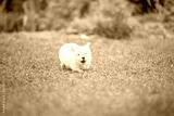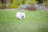 Cute white puppy, Maltese dog breed, running in garden, happy and healthy dog