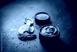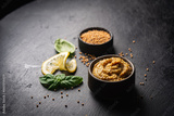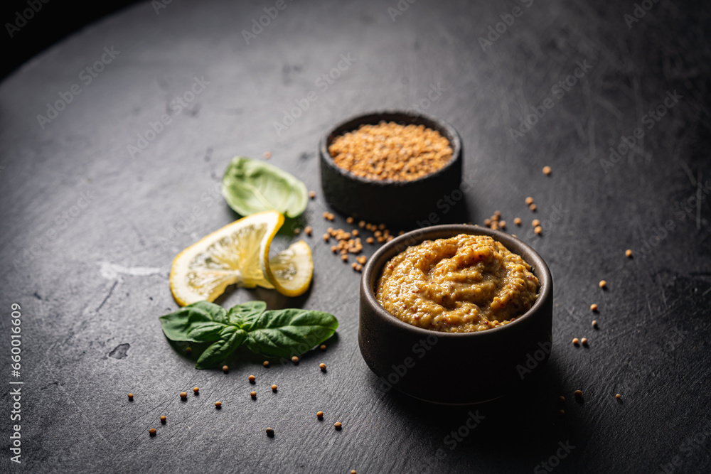 Fresh homemade organic dijon mustard in a bowl on black background, close up