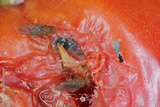 Adults females Drosophila suzukii - commonly called the spotted wing drosophila or SWD. It is a fruit fly a major pest species.