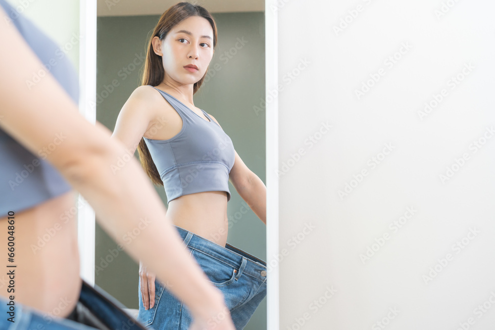 Shape slender, thin waist, attractive slim asian young woman, beautiful girl hand show shape her weight loss, wearing in big, large or over size jeans and looking into mirror. People body fit healthy.