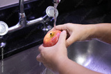 hands washing an apple under running water
