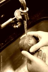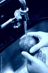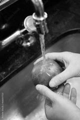 hands washing an apple under running water