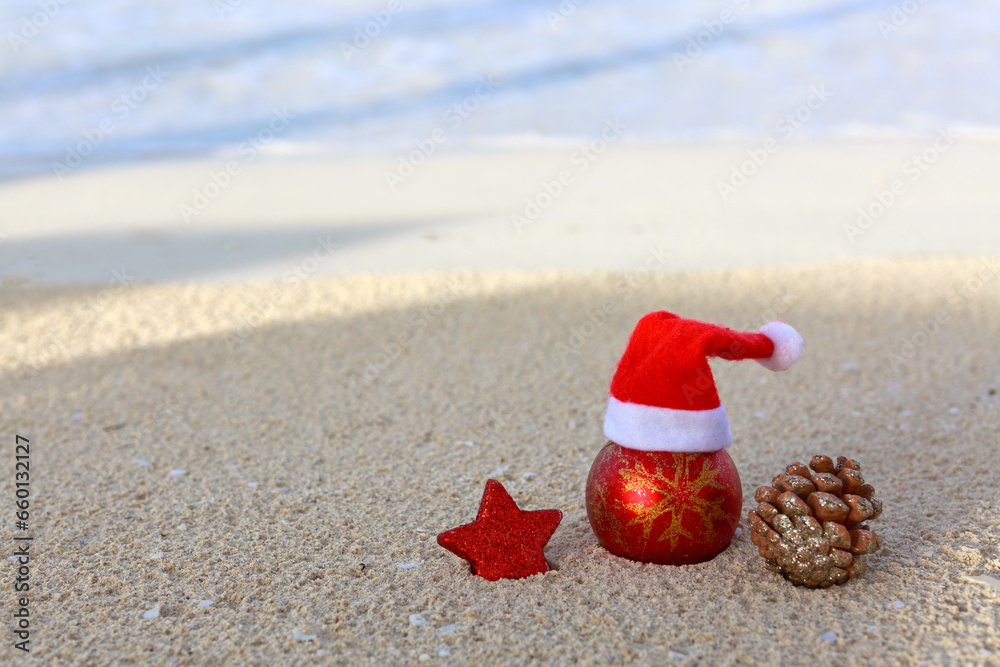 Merry Christmas background with red decorations on Caribbean beach.