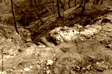 Spring, a stream in a wooded area, a stream of water rushes to a large river.