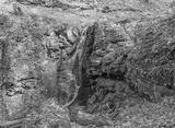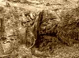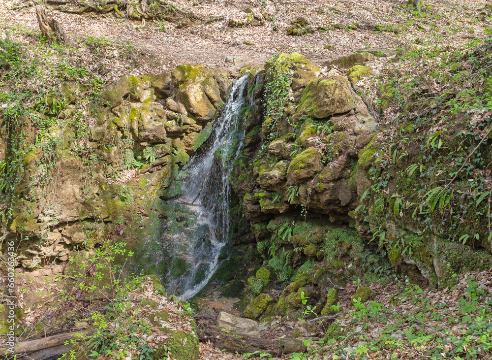 Spring, a stream in a wooded area, a stream of water rushes to a large river.