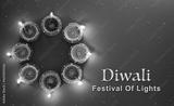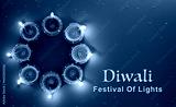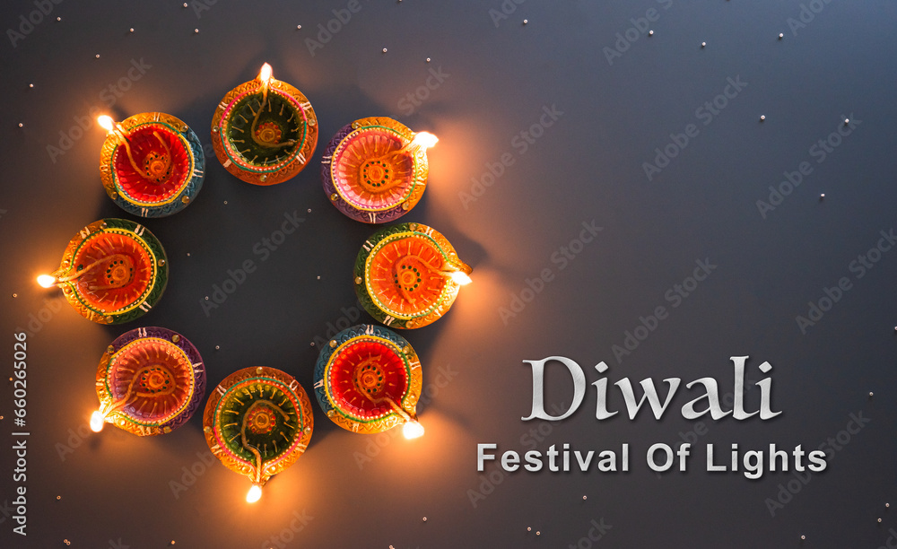 Happy Diwali - Clay Diya lamps lit during Diwali, Hindu festival of lights celebration. Colorful traditional oil lamp diya on blue background