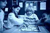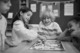 Multiethnic group of little children playing board game together in preschool and moving game pieces, copy space